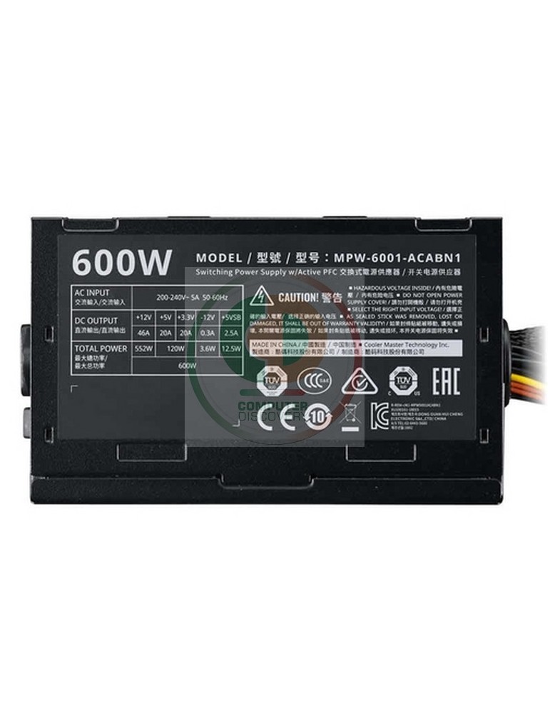 Cooler Master Elite V3 230V 600W. Potenza totale: 600 W, Tensione di ingresso AC: 200 - 240, Frequenza di ingresso AC: 47 - 63. Diametro del ventilatore: 12 cm, Numero di ventole: 1 ventola(e). Connettore scheda madre: 20+4 pin ATX, Lunghezza del cavo di alimentazione della scheda madre: 50 cm, Lunghezza del cavo di alimentazione SATA: 750 mm. Utilizzo: PC, Fattore di forma dell'unità di alimentazione (PSU): ATX, Fattore di forma scheda madre supportato: ATX. Colore del prodotto: Nero