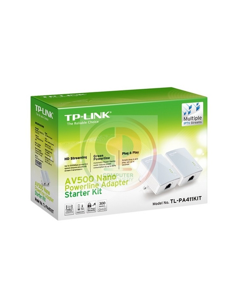 TP-LINK PA411KIT. Velocità massima di trasferimento dati: 500 Mbit/s, Standard di rete: IEEE 802.3,IEEE 802.3u, Tipo di interfaccia LAN Ethernet: Fast Ethernet. Consumi: 2 W. Colore del prodotto: Bianco, Indicatori LED: LAN, PLC, Potenza, Certificazione: FCC. Sistema operativo Windows supportato: Windows 2000,Windows 2000 Professional,Windows 7 Home Basic,Windows 7 Home Basic x64,Windows 7.... Larghezza: 65 mm, Profondità: 52 mm, Altezza: 28,5 mm