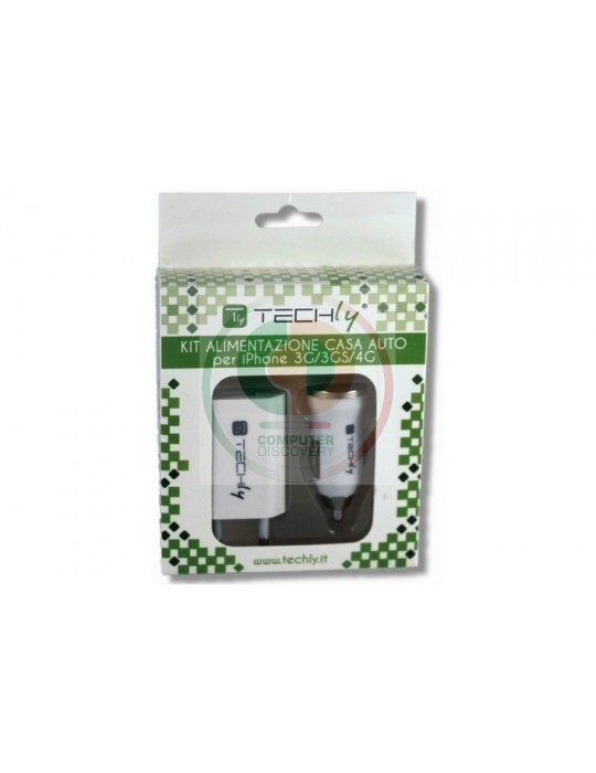 Techly Kit alimentazione casa auto per iPhone 3G/3GS/4G (IPW-USB-KIT). Tipo di caricatore: Auto, Interno, Compatibilità caricatore: Telefono cellulare, Tipologia alimentazione: AC, Accendisigari. Colore del prodotto: Bianco, Lunghezza cavo: 1 m. Voltaggio di ingresso: 100 - 240, Tensione di uscita (max): 5 V, Frequenza di ingresso: 50 - 60. Peso: 70 g. Cavi inclusi: USB