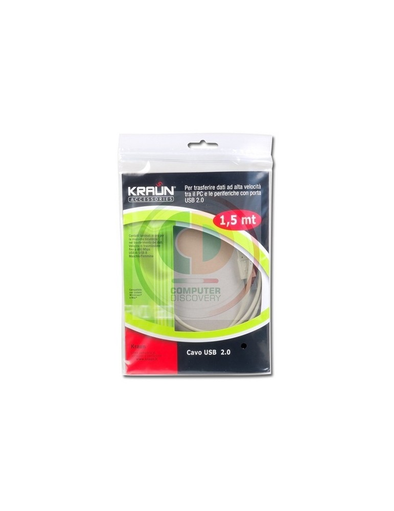Kraun 1.5m USB 2.0. Versione USB: 2.0, Connettore 1: USB A, Connettore 2: USB B. Numero di prodotti inclusi: 1 pezzo(i)