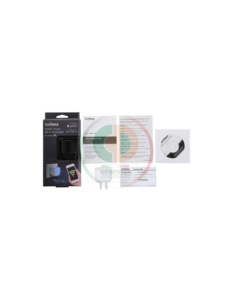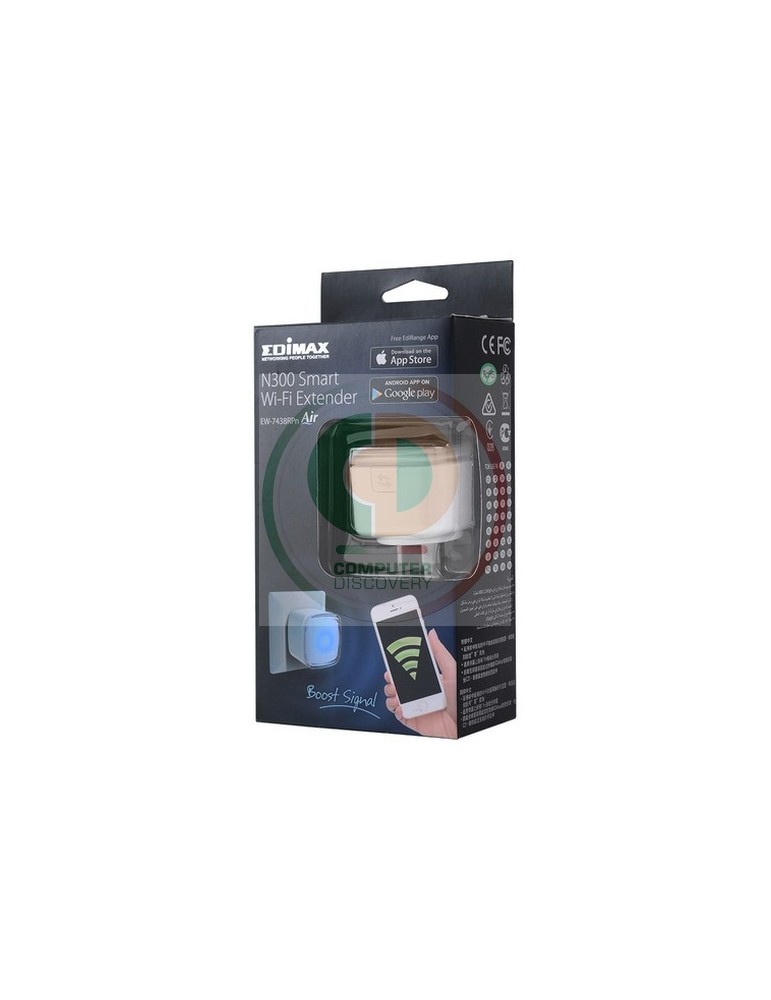 Edimax EW-7438RPn Air. Standard di rete: IEEE 802.11b, IEEE 802.11g, IEEE 802.11n, Standard Wi-Fi: 802.11b, 802.11g, 802.11n, Velocità trasferimento dati wireless LAN (max): 300 Mbit/s. Tensione di ingresso AC: 100-240 V, Frequenza di ingresso AC: 50/60 Hz, Corrente ingresso: 0.15. Larghezza: 4,2 cm, Profondità: 7,2 cm, Altezza: 4,2 cm. Certificazione: FCC, CE. Colore del prodotto: Bianco