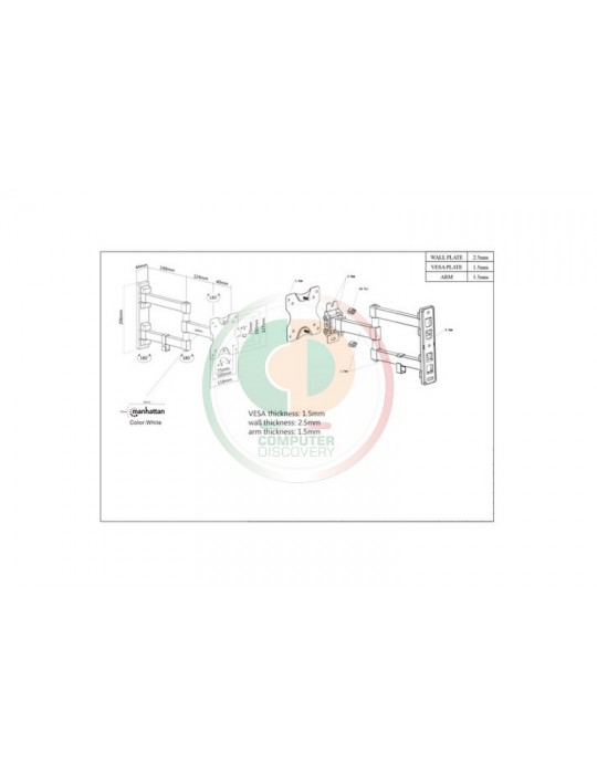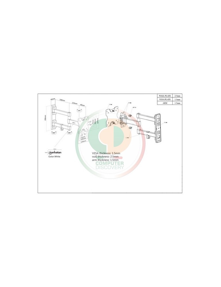 Manhattan 461382. Peso massimo (capacità): 20 kg, Capienza minima dimensioni dello schermo: 33 cm (13"), Capienza massima dimensioni dello schermo: 68,6 cm (27"), Compatibilità interfaccia di montaggio (min): 75 x 75 mm, Compatibilità interfaccia di montaggio (max): 100 x 100 mm. Angolo di rotazione: -90 - 90°, Inclinazione: -12 - 5°. Colore del prodotto: Nero