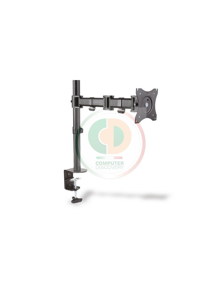 Morsetto da scrivania monitor singolo Digitus, nero, Girevole 45°, inclinabile 45°, ruotabile 360°, 38-69cm, TFT, Peso massimo 8Kg, VESA max 100x100 Supporto universale per monitor per un posizionamento flessibile del monitor sulla propria postazione di lavoro, con possibilità di inclinazione e di rotazione orizzontale e verticale.Regolate lo schermo a un’altezza più comoda per la visione.Il supporto per monitor consente il montaggio di schermi LED o LCD di qualsiasi marca.Ê sufficiente fare attenzione alle dimensioni VESA e al peso dello schermo per scegliere il supporto appropriato. Compatibile con gli standard VESA 75 x 75 e 100 x 100 mm Fino a un carico massimo di 8 Kg Per schermi fino a 69cm (27'') e un peso massimo di 8kg Angolo di inclinazione verticale regolabile fin