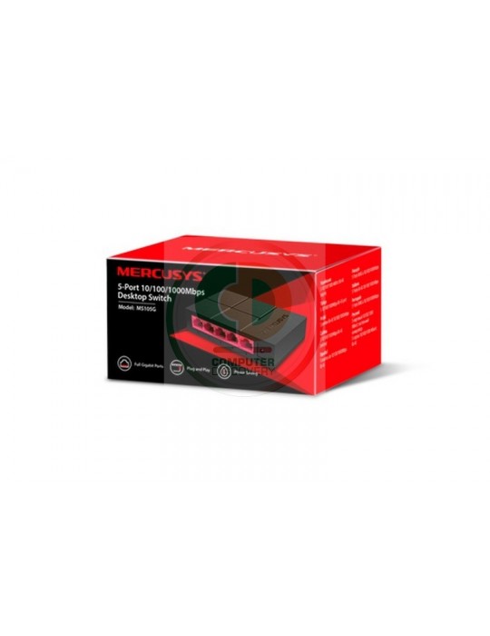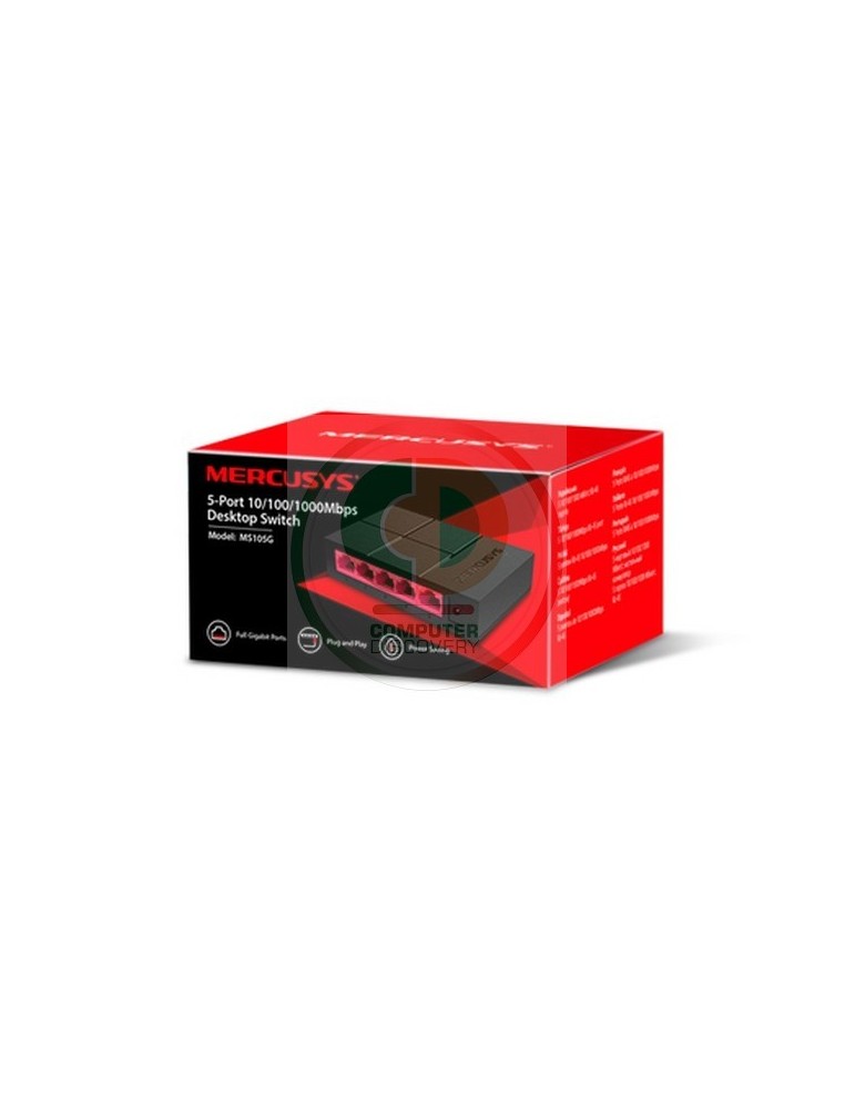 Mercusys MS105G. Tipo di porte RJ-45: Gigabit Ethernet (10/100/1000), Quantità di porte RJ-45: 5. Full duplex. Capacità di commutazione: 10 Gbit/s. Standard di rete: IEEE 802.3,IEEE 802.3u,IEEE 802.3x. Voltaggio input DC: 5 V