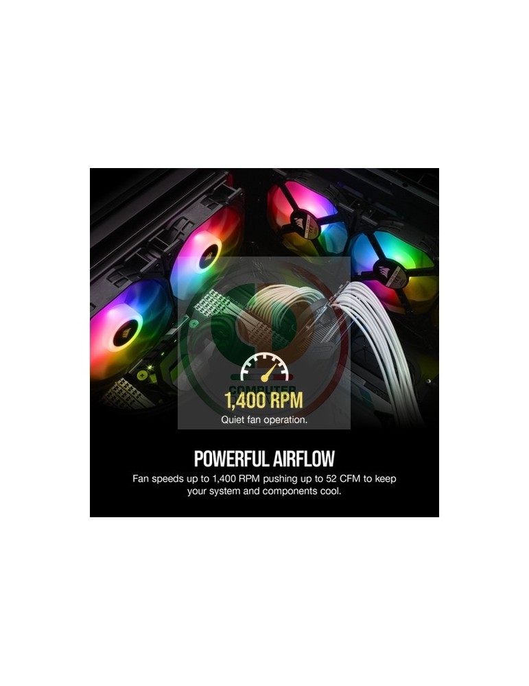 Corsair CO-9050093-WW. Tipo: Ventilatore, Diametro del ventilatore: 12 cm, Velocità (massima) di rotazione: 1400 Giri/min, flusso d'aria massimo: 52 pdc/min. Larghezza: 120 mm, Profondità: 25 mm, Altezza: 120 mm. Colore del prodotto: Nero, Grigio